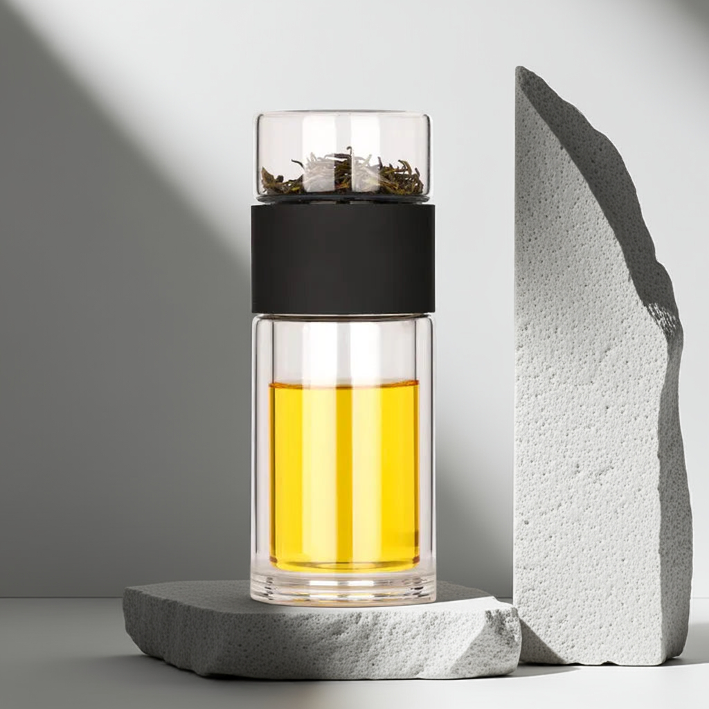 Opplev en ny måte å drikke te på med vår elegante, bærbare teflaske i høykvalitets borosilikatglass. Den smarte løsningen med separat tebeholder gjør det enkelt å brygge løsvektste – uten søl, og akkurat slik du liker det. Perfekt for deg som vil ha en rolig tepause, enten du er på kontoret, på reise eller bare på farten.